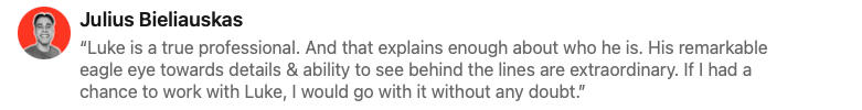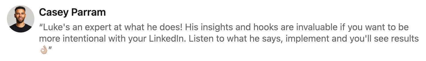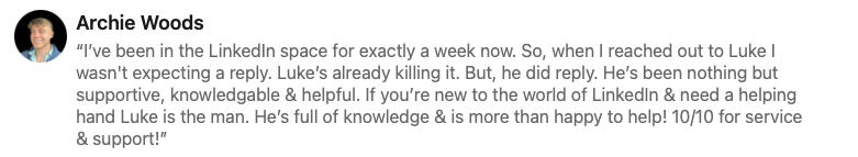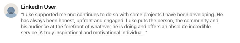 I'm Luke, a personal branding + business coach specialising in LinkedIn™ to help service-based founders + solopreneurs grow their business.I'm not a coach who sells you a magical course that will change your life. I work closely with those who understand the long-term game, and are willing to invest in it.In return, I'll help you set up content creation strategies to grow on LinkedIn™, and set up lead conversion opportunities to help you turn that traffic into leads. No awkward sales focus, no fuss. Just humans doing what humans do best. Being social + helping one another.I built these strategies because I hated trying to do sales the old way. Building my personal brand was the best thing I ever did. Now it's your turn.Are you ready?